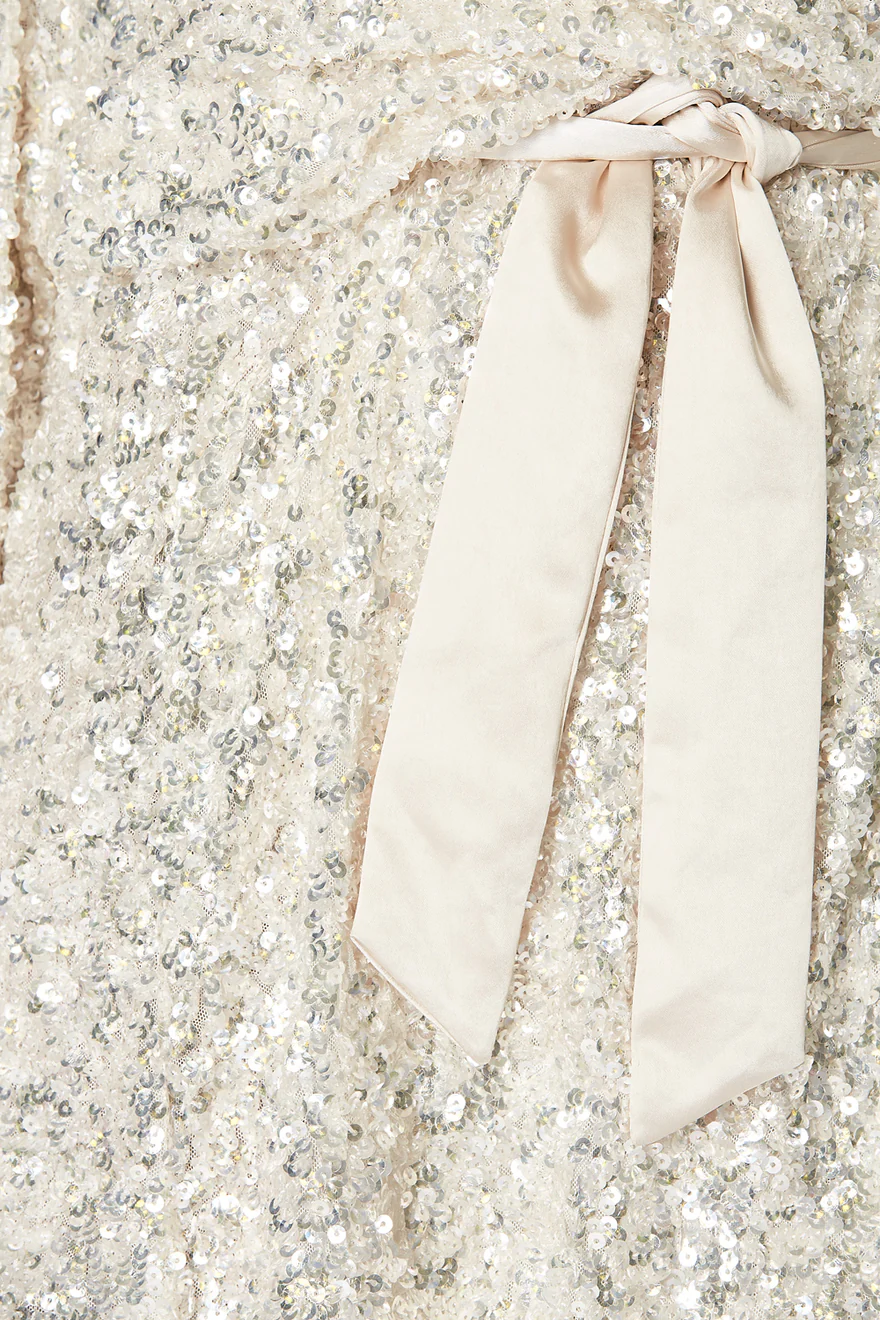 The Synergy Dress features a wrap-style front with drop shoulder, finished in iridescent micro-sequin textile on a stretch mesh base.